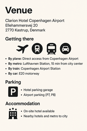 While the conference takes place at Clarion Hotel Copenhagen Airport, we’ve secured a limited number of discounted rooms at the Comfort Hotel Copenhagen Airport — just across the street.